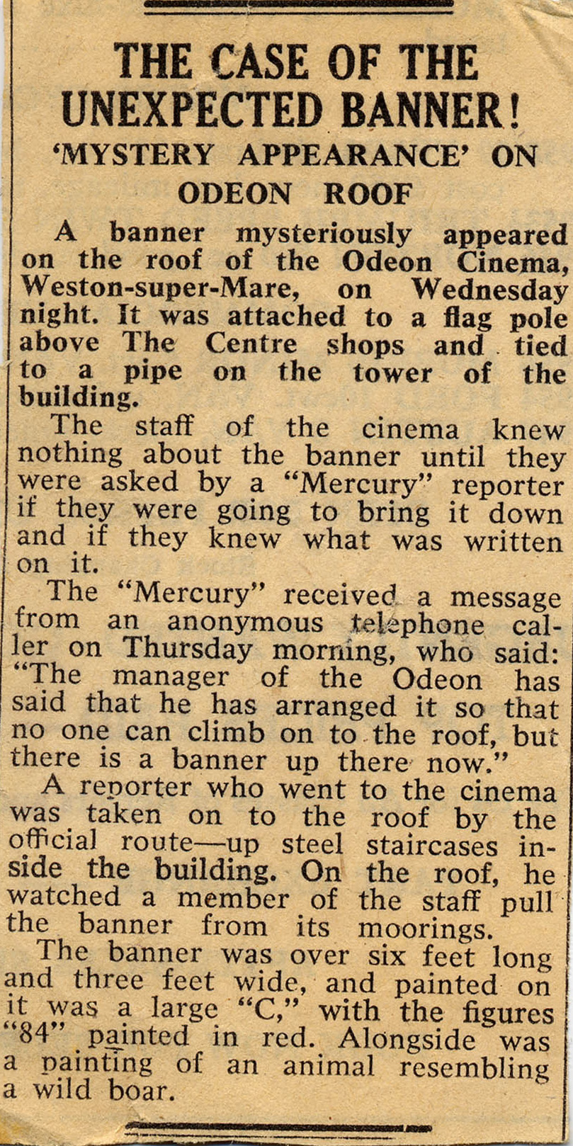 “Probably one of the major escapades that the 84th planned and executed was the flag on the Odeon cinema in Weston. One of our number managed to climb onto the roof of the cinema one Wednesday evening and hoisted the Entry flag on a vacant pole. Being unable to re-enter the cinema, he made his way across several rooftops until he managed to get to the ground in someone’s back-yard. The Weston Mercury was telephoned the following day and we in due course achieved our aim of some little publicity in the next edition of the paper.” See the newspaper clipping supplied by Derek Orgill - The Case of the Unexpected Banner.